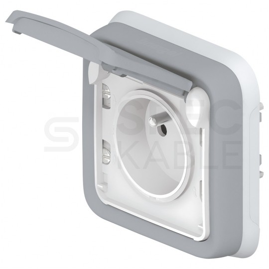 Legrand PLEXO 55 to pojedyncze gniazdo 2P+Z p/t 16 A, 250 V z klapką, o stopniu ochrony IP55 i odporności IK07, wykonane z bezhalogenowego tworzywa (mat, szary RAL 7016) — idealne do miejsc narażonych na wilgoć i uderzenia.