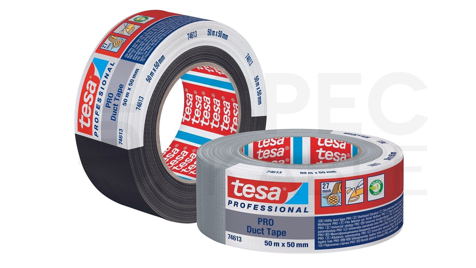 Taśma naprawcza tesa PRO Duct Tape 74613 (50 mm × 50 m, czarna) to uniwersalna taśma samoprzylepna z klejem z kauczuku syntetycznego i wzmocnionym nośnikiem PET, w ponad 60% z recyklingu pokonsumenckiego, do szybkich napraw, mocowania, uszczelniania, znakowania i pakowania wewnątrz oraz na zewnątrz.