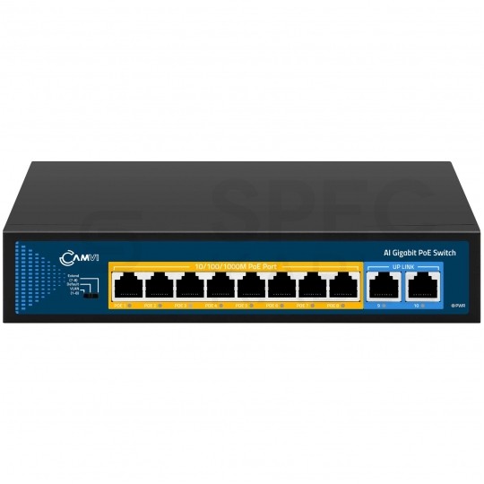 CAMVI to niezarządzalny switch desktop z 10×RJ45: 8×PoE+ dla kamer/AP/VoIP i 2×uplink Gigabit, w metalowej obudowie i z magistralą 20 Gb/s.