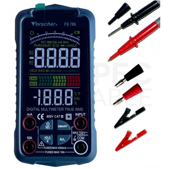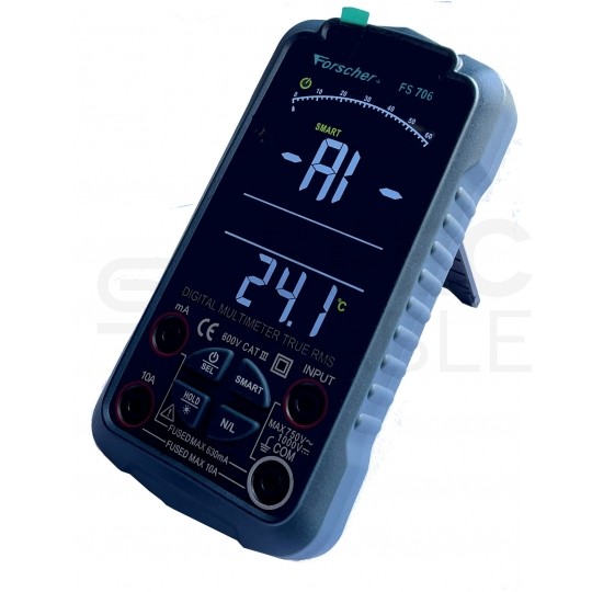 Forscher FS706 to True RMS multimetr z inteligentnym trybem AI, który sam dobiera funkcję i zakres (AC/DC, ciągłość, rezystancja), więc mierzysz bez przełączania i ryzyka błędu.