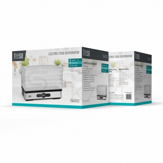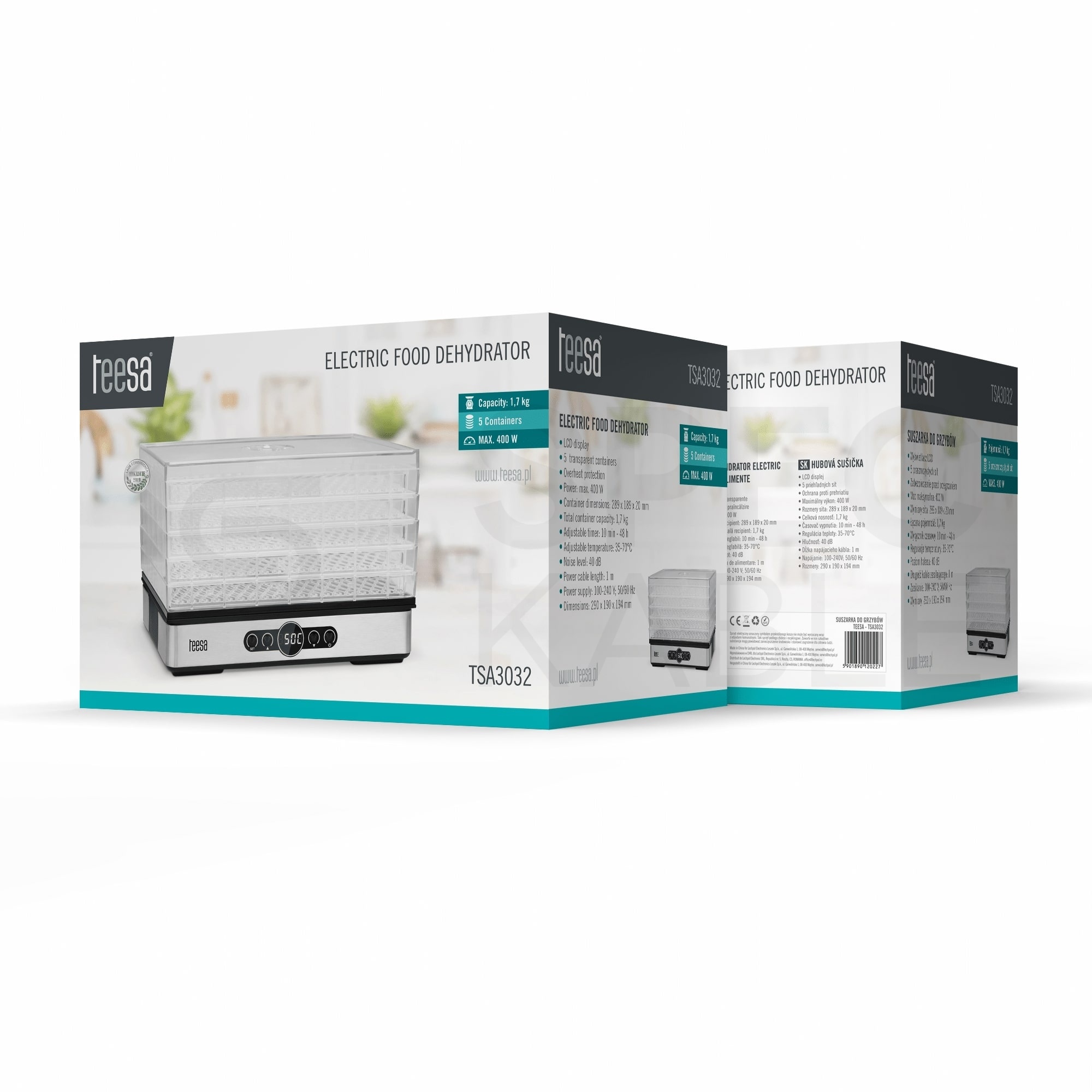 Suszarka do żywności Teesa TSA3030 o mocy 400 W oferuje regulację temperatury 35–70°C i timer do 48 h, a pięć przezroczystych sit pozwala jednorazowo wysuszyć do 1,7 kg grzybów, owoców, warzyw, ziół czy kwiatów.
