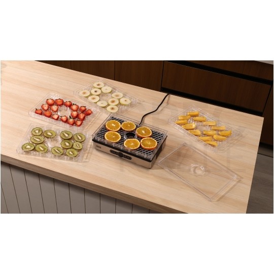 Przezroczyste tace umożliwiają kontrolę suszenia bez konieczności otwierania urządzenia, co zapewnia stałą temperaturę i efektywność.