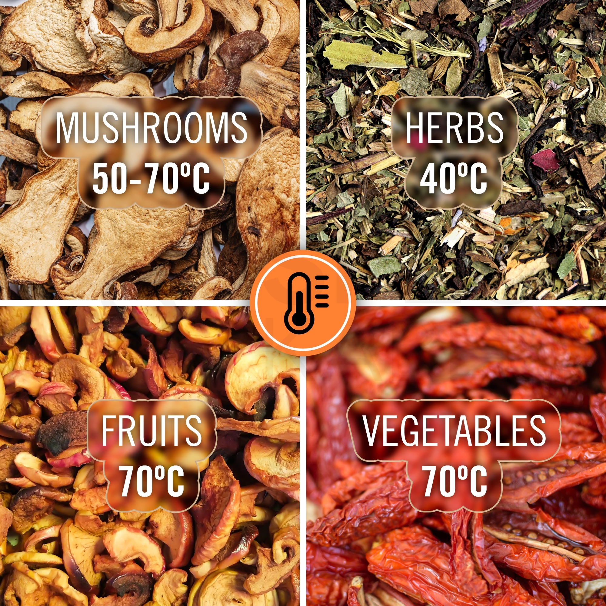 Precyzyjne ustawienie temperatury pozwala na dostosowanie procesu suszenia do różnych rodzajów produktów, od delikatnych ziół po grzyby i owoce. Timer do 48 godzin gwarantuje elastyczność i wygodę podczas długotrwałego suszenia.