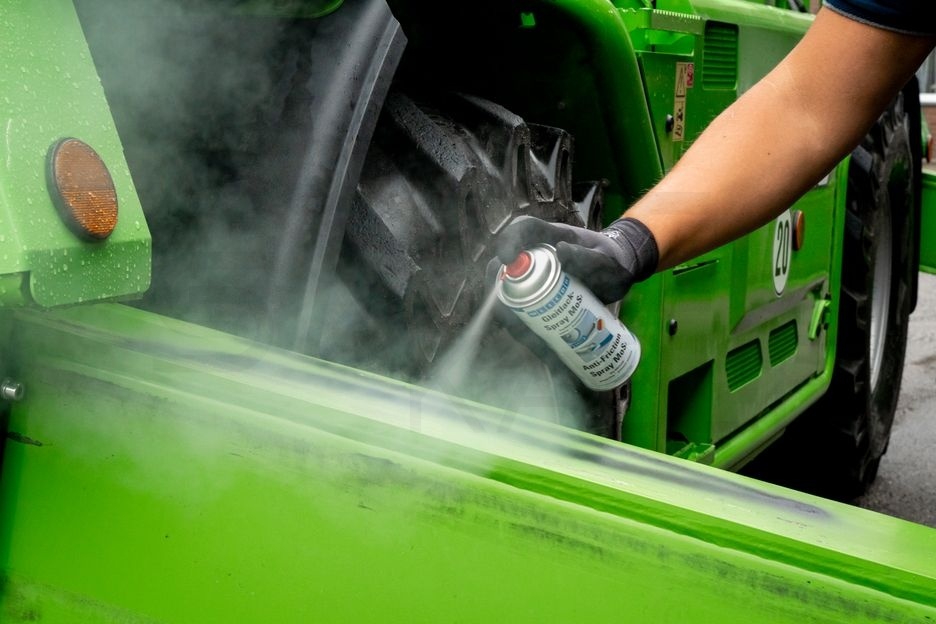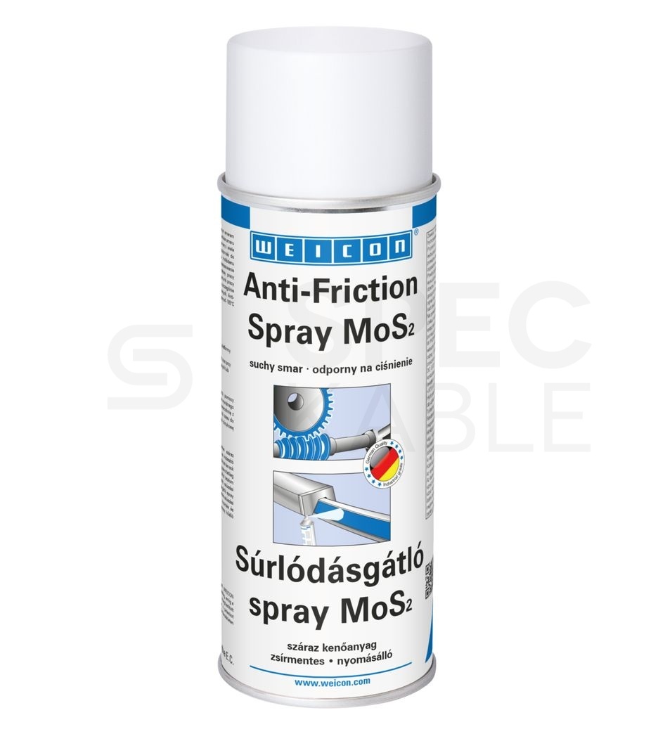 WEICON Anti-Friction Spray MoS2 w sprayu 400 ml to antracytowo-czarny, suchy smar na bazie MoS₂ o zapachu rozpuszczalników i bardzo wysokiej odporności termicznej od −200 do +450 °C (krótkotrwale do +500 °C), który wysycha po 2–3 minutach, osiąga pełną wytrzymałość po 0,5 h, a jego okres przydatności wynosi 24 miesiące.