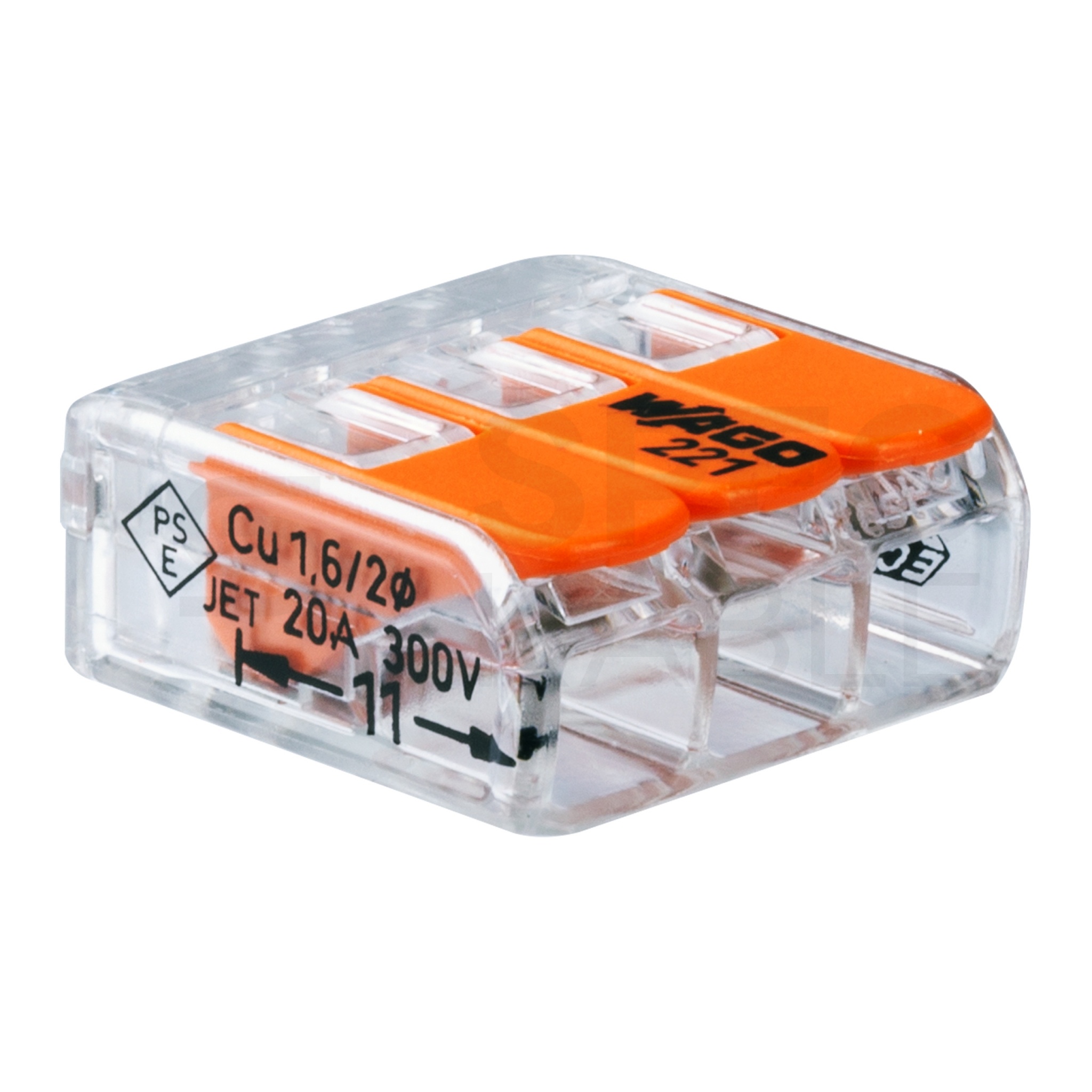 Szybkozłączka instalacyjna WAGO uniwersalna serii 221 COMPACT wyposażona w zacisk CAGE CLAMP przeznaczona do łączenia przewodów jednodrutowych (tzw. drut) oraz wielodrutowych (tzw. linka).