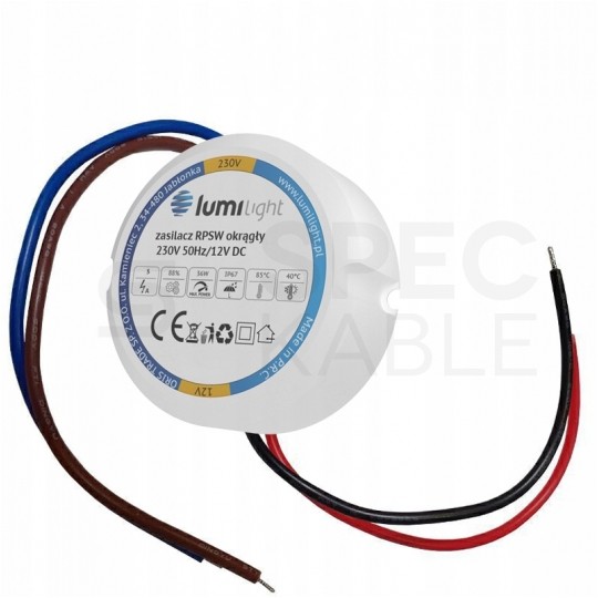 Zasilacz Lumilight RPS 24V 1,5A o mocy 36 W to kompaktowe i uniwersalne źródło zasilania, które dzięki średnicy 55 mm i głębokości 22 mm idealnie mieści się w standardowej puszce instalacyjnej Φ60.