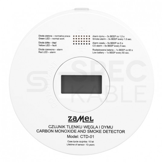 ZAMEL CTD-01 to czujnik 2-w-1, który nieprzerwanie wykrywa tlenek węgla i dym, alarmując głośnym sygnałem 85 dB oraz migającą diodą; ma czytelny wyświetlacz LCD, minimalny próg detekcji CO 30 ppm i przycisk test/wyciszenie.