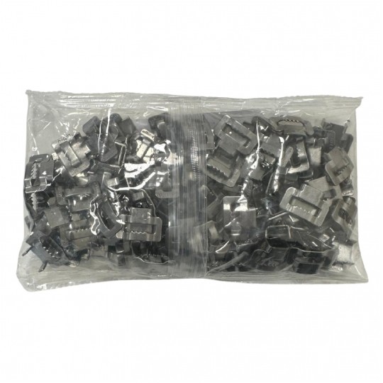 Klamerka/spinka z ząbkami do taśmy stalowej 10 mm marki Sdünnger zapewnia szybkie i pewne zaciskowe mocowanie opasek; ząbki trwale blokują taśmę, a grubość 1,20 mm i 14-mm okno ułatwiają montaż oraz przenoszenie dużych obciążeń.