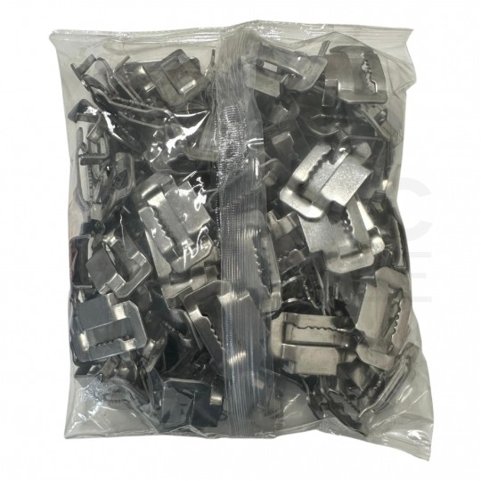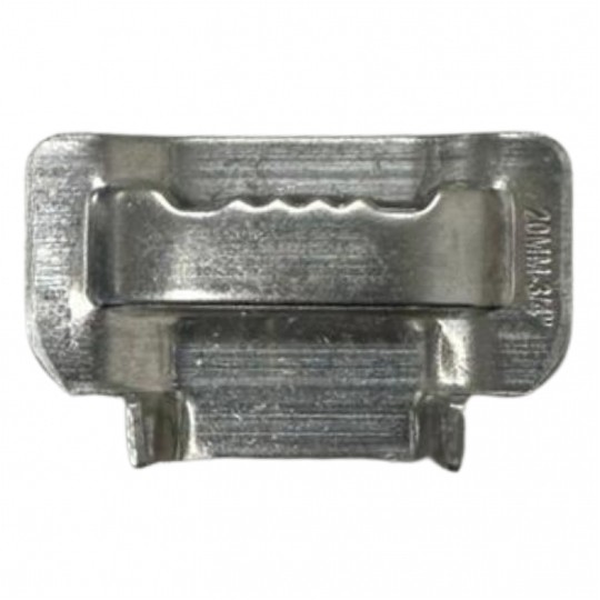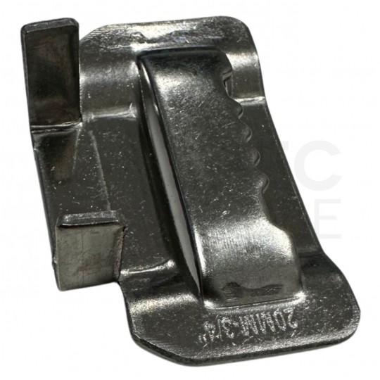Klamerka/spinka z ząbkami do taśmy stalowej 20 mm marki Sdünnger zapewnia szybkie i pewne zaciskowe mocowanie opasek; ząbki trwale blokują taśmę, a grubość 1,50 mm i 23-mm okno ułatwiają montaż oraz przenoszenie dużych obciążeń.