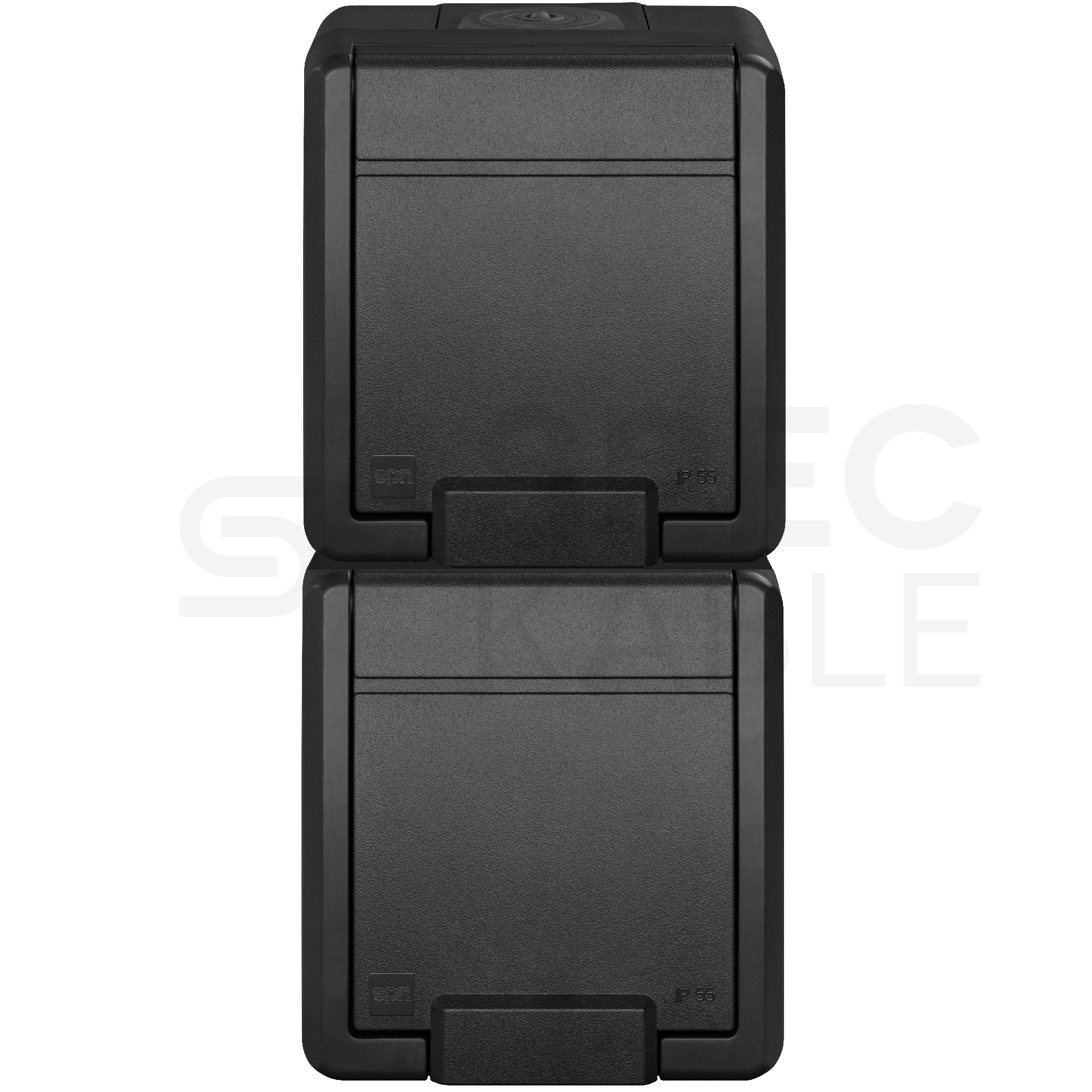 Podwójne pionowe gniazdo natynkowe AQUANT™ 2K IP55 zapewnia niezawodne zasilanie w wymagających warunkach, dzięki hermetycznej konstrukcji odpornej na wodę, pył oraz promieniowanie UV.