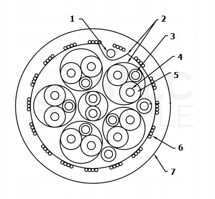 - Ekranowanie: wielowarstwowy ekran ogólny - folia aluminiowa wraz z drutem uziemiającym + oplot z miękkich drutów (16 x 4 włókna) oraz indywidualny ekran z folii aluminiowej (wraz z drutem uziemiającym) na 5 parach żył roboczych