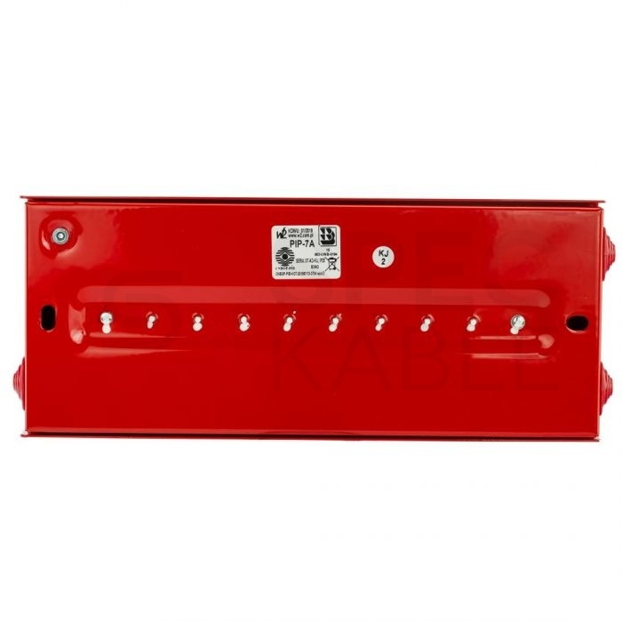Puszka instalacyjna PIP-7AN do systemów pożarowych wykonana została z blachy pokrytej czerwoną farbą proszkową. Wewnątrz zawiera kostki ceramiczne umożliwiające łączenie przewodów o maksymalnie dziesięciu parach, przy maksymalnym przekroju 1 żyły równym 4mm².