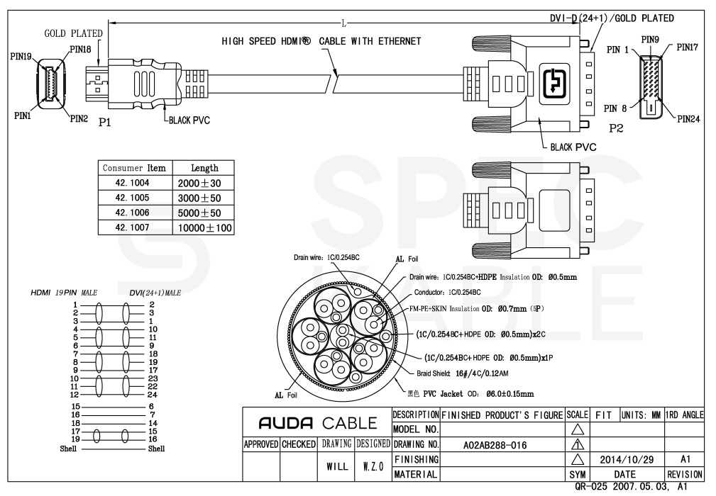 Typ złączy: | DVI-D 24+1-pin (wtyk) / HDMI typ A 19-pin (wtyk) |