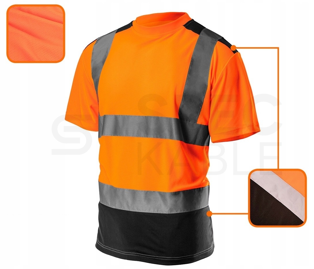 T-shirt roboczy ostrzegawczy NEO o intensywnej widzialności to praktyczne rozwiązanie zwiększające bezpieczeństwo użytkownika, polegające na sygnalizowaniu jego obecności w każdych warunkach oświetlenia dziennego jak i w ciemności w sztucznym oświetleniu np. światłami pojazdów.