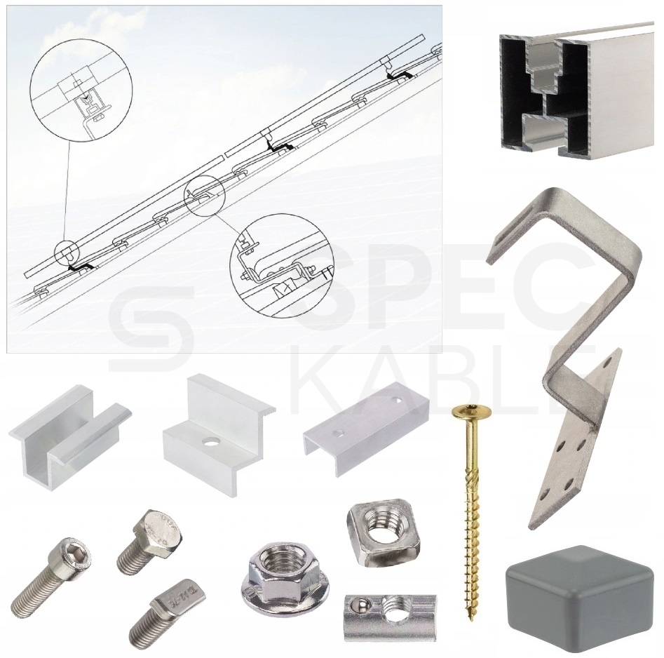 Konstrukcja montażowa umożliwiająca zamocowanie paneli fotowoltaicznych na dachu skośnym pokrytym blachą mocowaną na rąbek stojący.