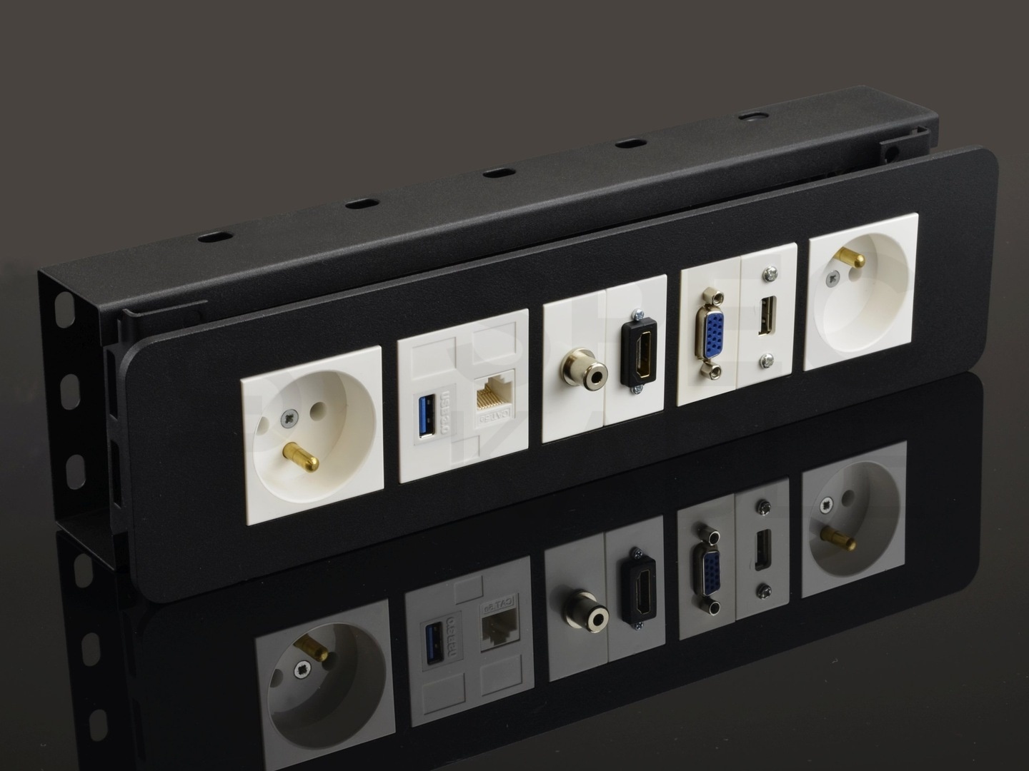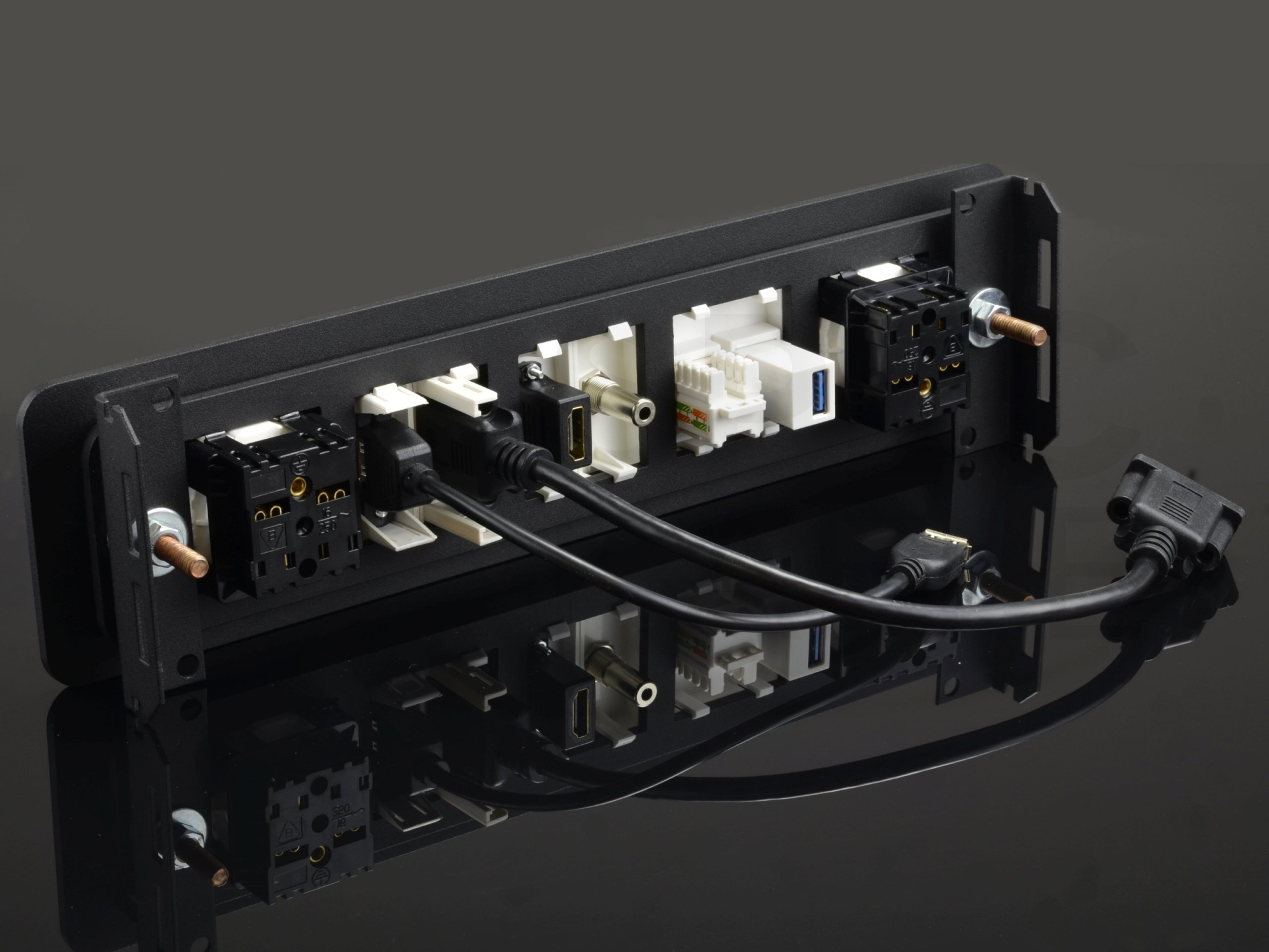Moduły Mediabox przeznaczone są do montażu w ramkach wyposażonych w supporty, puszkach podłogowych, kolumnach wysuwanych z blatu oraz listwach i korytach naściennych przystosowanych do montażu osprzętu modułowego 45x45mm.