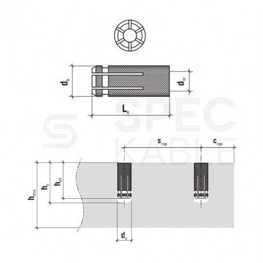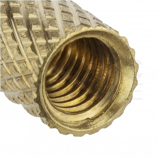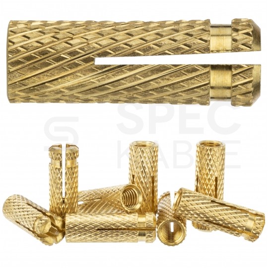Tuleja mosiężna KRM składa się z tulei rozporowej z gwintem wewnętrznym w połączeniu z nagwintowanym trzpieniem lub wkręcaną śrubą z łbem sześciokątnym. Strefa rozpierania jest podzielona wzdłużnymi wycięciami na cztery lub sześć części.