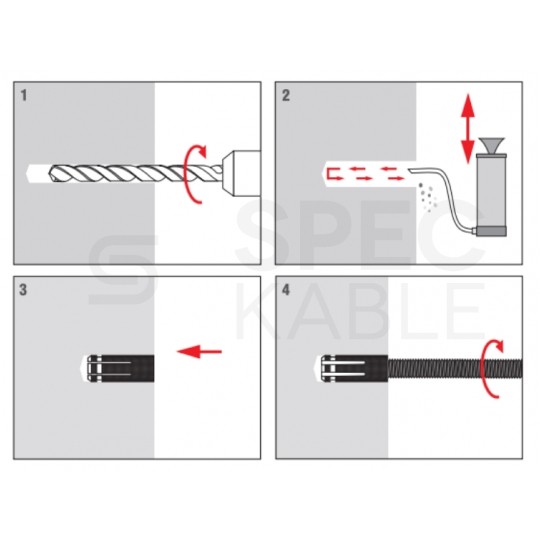 Zamocowanie w podłożu następuje w wyniku wkręcenia elementu nagwintowanego, co powoduje przesunięcie stożka rozpierającego w wyniku czego następuje trwale zakotwienie. Kotwa KRM stosowana jest jako korpus rozporowy pod elementy łączące posiadające gwint metryczny (śruby metryczne, pręty gwintowane, pręty dwugwintowe).