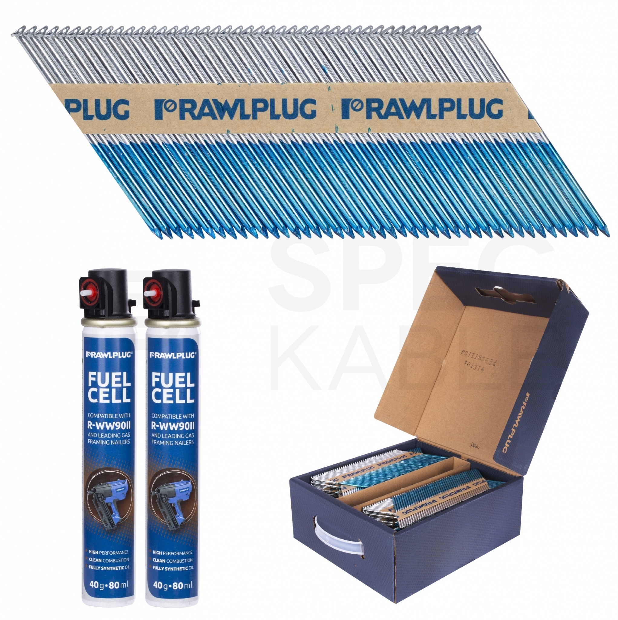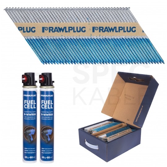 Gwoździe do drewna 3,1x90mm ocynkowane, gładkie na papierze 2200 sztuk + 2x gaz do gwoździarki WW90II Rawlplug R-DPG-3190-V