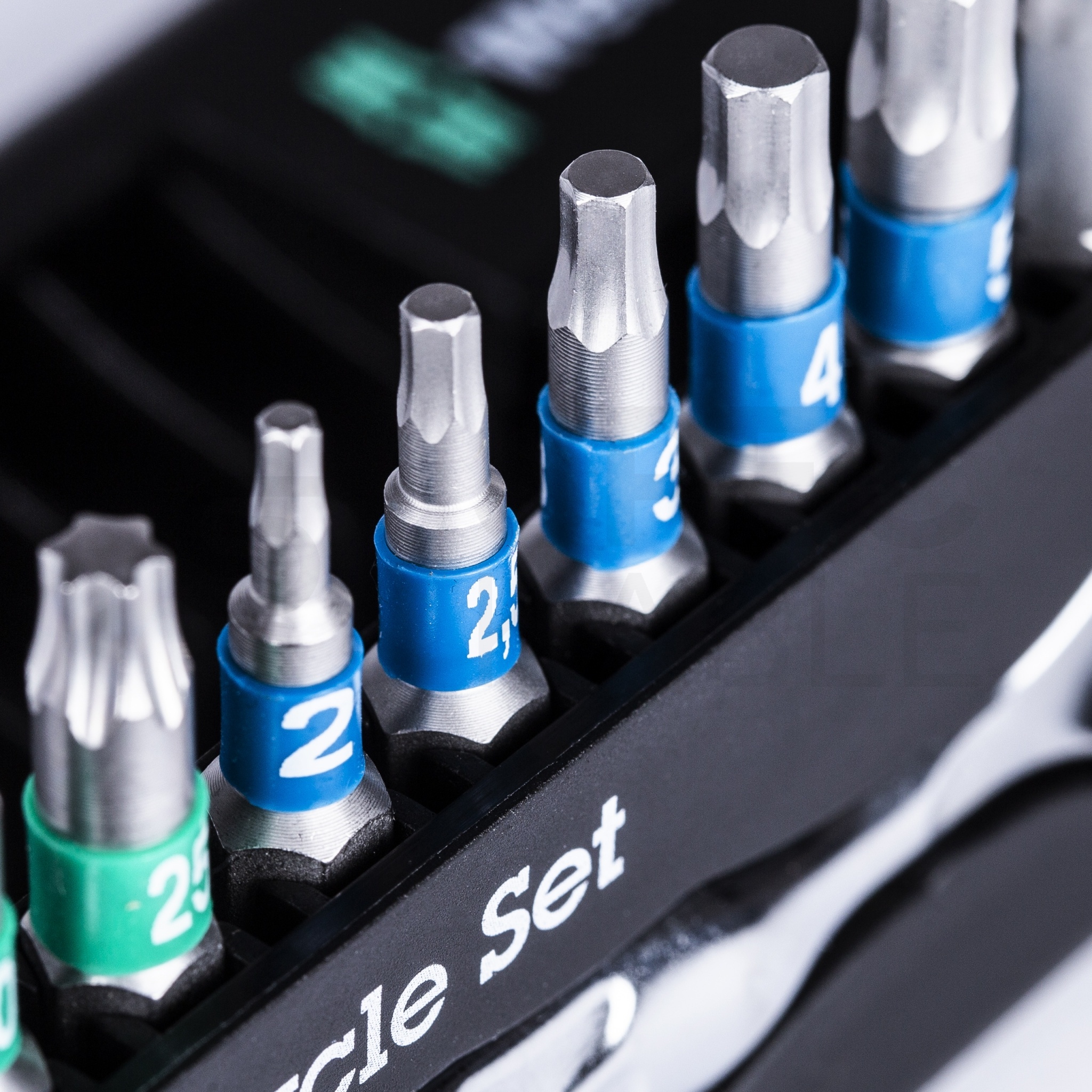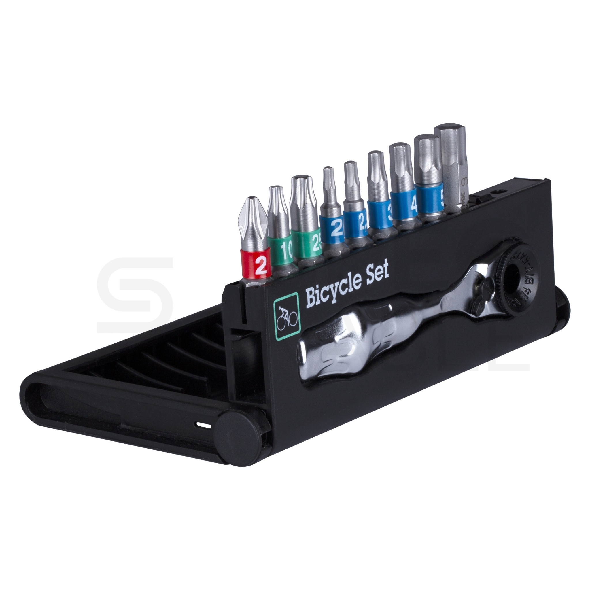 Zestaw składający się z 9 bitów ze stali nierdzewnej oraz grzechotki do bitów Zyklop Mini 1 to doskonałe akcesorium przeznaczone do stosowania w różnych częściach roweru, które wymagają regulacji, montażu lub demontażu.