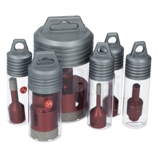 Każda z otwornic jest zapakowana w wygodny, odkręcany pojemnik plastikowy.